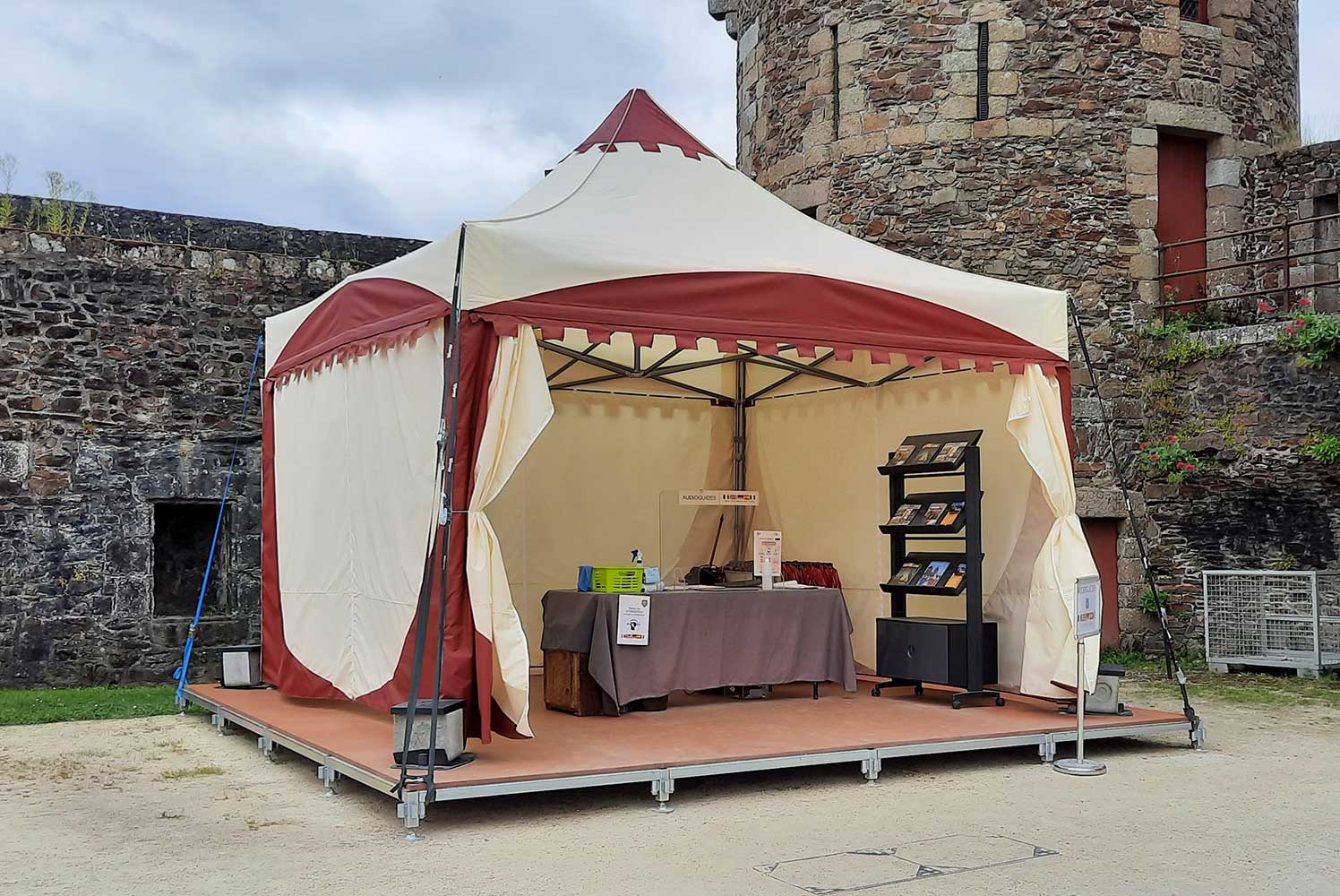 - Si votre événement est plus long, vous pouvez opter pour une tente V2 qui est plus robuste avec un système d’assistance au déploiement par vérin à gaz breveté.